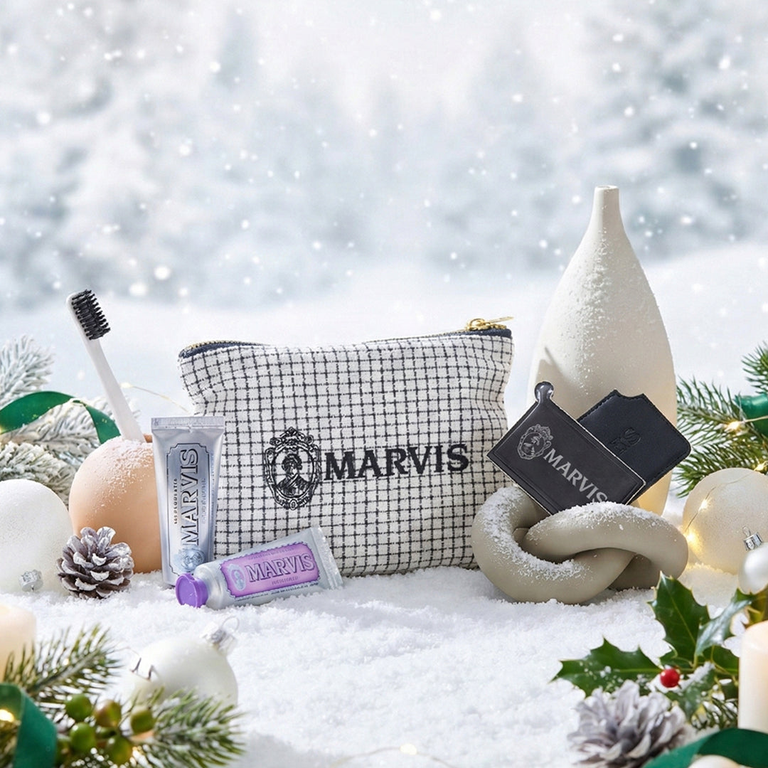 [商品情報]・トゥースペースト ホワイト・ミント 25mL ×1・トゥースペースト ジャスミン・ミント 25mL ×1・トゥースブラシ (ホワイト)×1 ・MARVIS ポケットミラー ×1 サイズ:5.5㎝×8.2㎝×0.8㎜・MARVIS チェックバッグ ×1 素材:オーガニックコットン ※エコテックス®スタンダード100の認証取得済み サイズ:19×14㎝